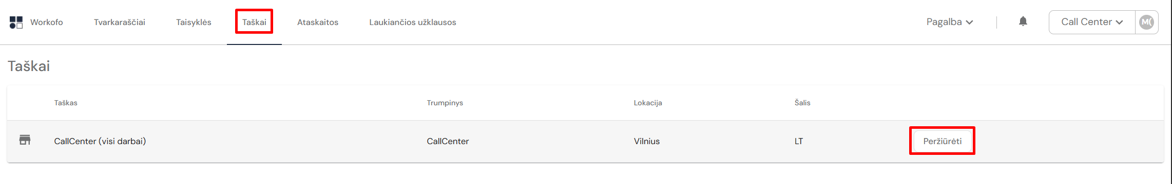 3. Sąraše pasirenkti tašką, kuriam reikia pakeisti darbo valandas, paspausti mygtuką - Peržiūrėti