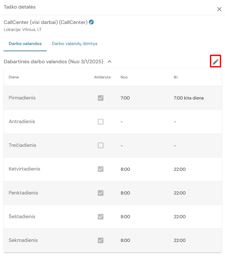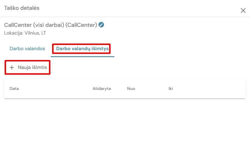 Esant poreikiui nurodyti kitas darbo valandas vienai dienai (pavyzdžiui, sausio 1d. darbo laikas neatitinka sekmadienio darbo laiko) sistemoje naudojamas funkcionalumas - Darbo valandų išimtys