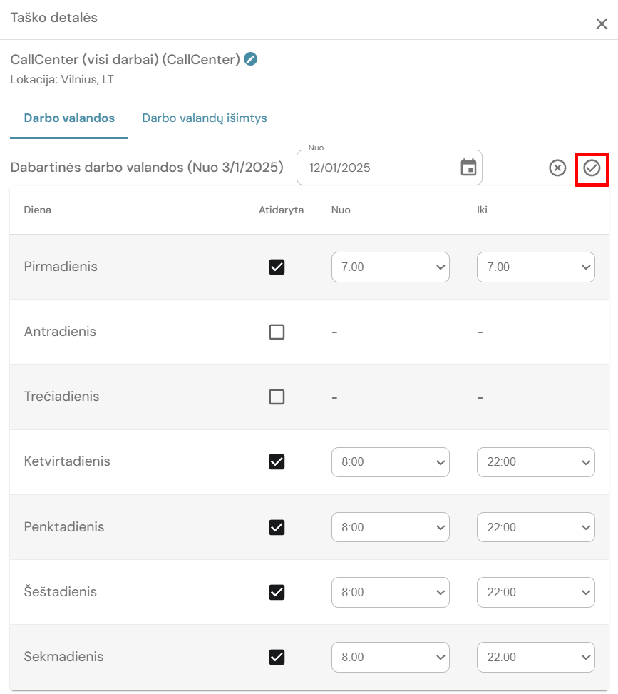 5. Nustatyti naujas darbo valandas pagal savaitės dieną, bei pasirinkti ar tomis dienomis taškas yra atidarytas