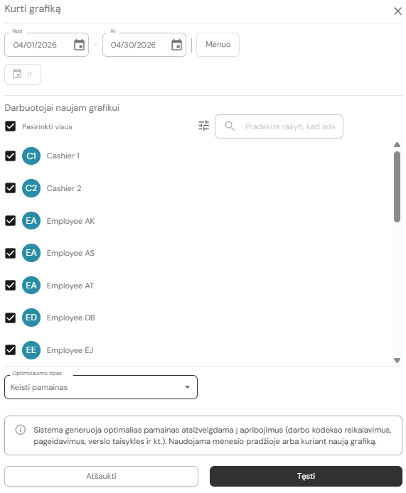 I. Jeigu sudarote naują grafiką rekomenduojame pasirinkti visus darbuotojus (sistema parenka automatiškai visus darbuotojus)