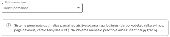 Keisti pamainas - Sistema generuoja optimalias pamainas atsižvelgdama į apribojimus (darbo kodekso reikalavimus, pageidavimus, verslo taisykles ir kt.). Naudojama mėnesio pradžioje arba kuriant naują grafiką.