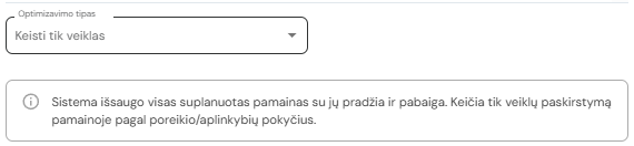 Keisti tik veiklas - Sistema išsaugo visas suplanuotas pamainas su jų pradžia ir pabaiga. Keičia tik veiklų paskirstymą pamainoje pagal poreikio/aplinkybių pokyčius.