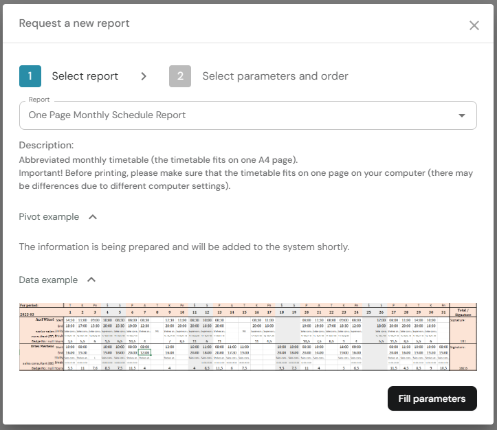 4. After the selecting the report you can check the description, data example, and pivot example. If you want to continue press Fill parameters.