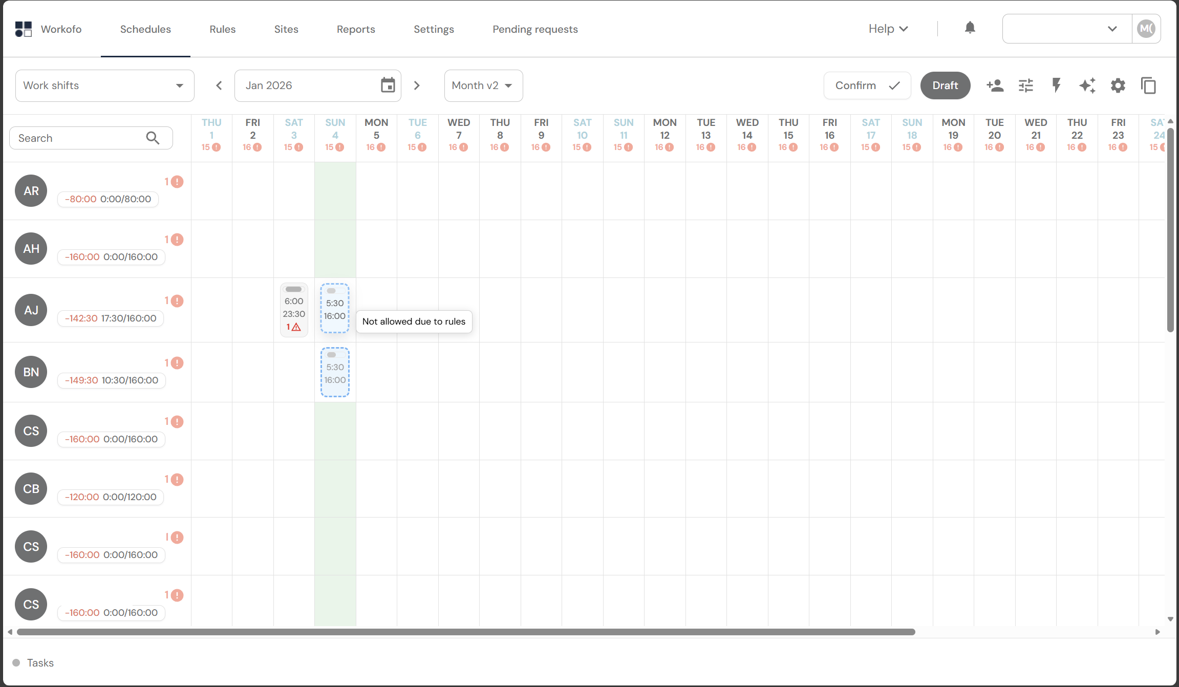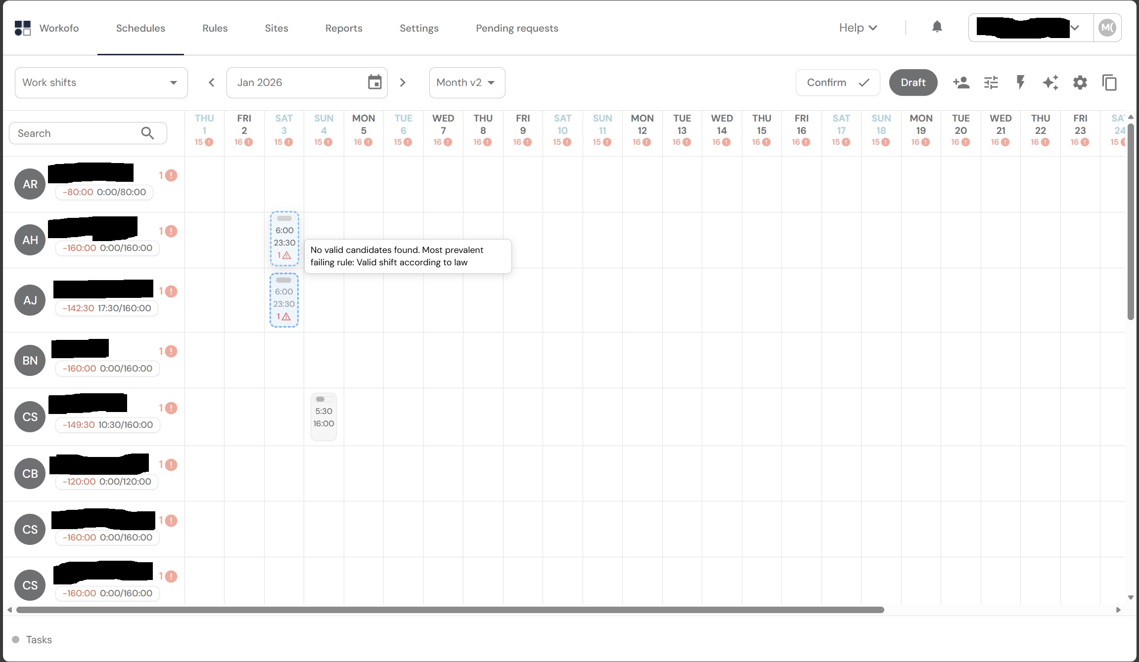 Exception: If you have a shift that does not comply with the labor code and you try to move it to another employee, the system will display an error indicating the reason. (Example in the photo below)