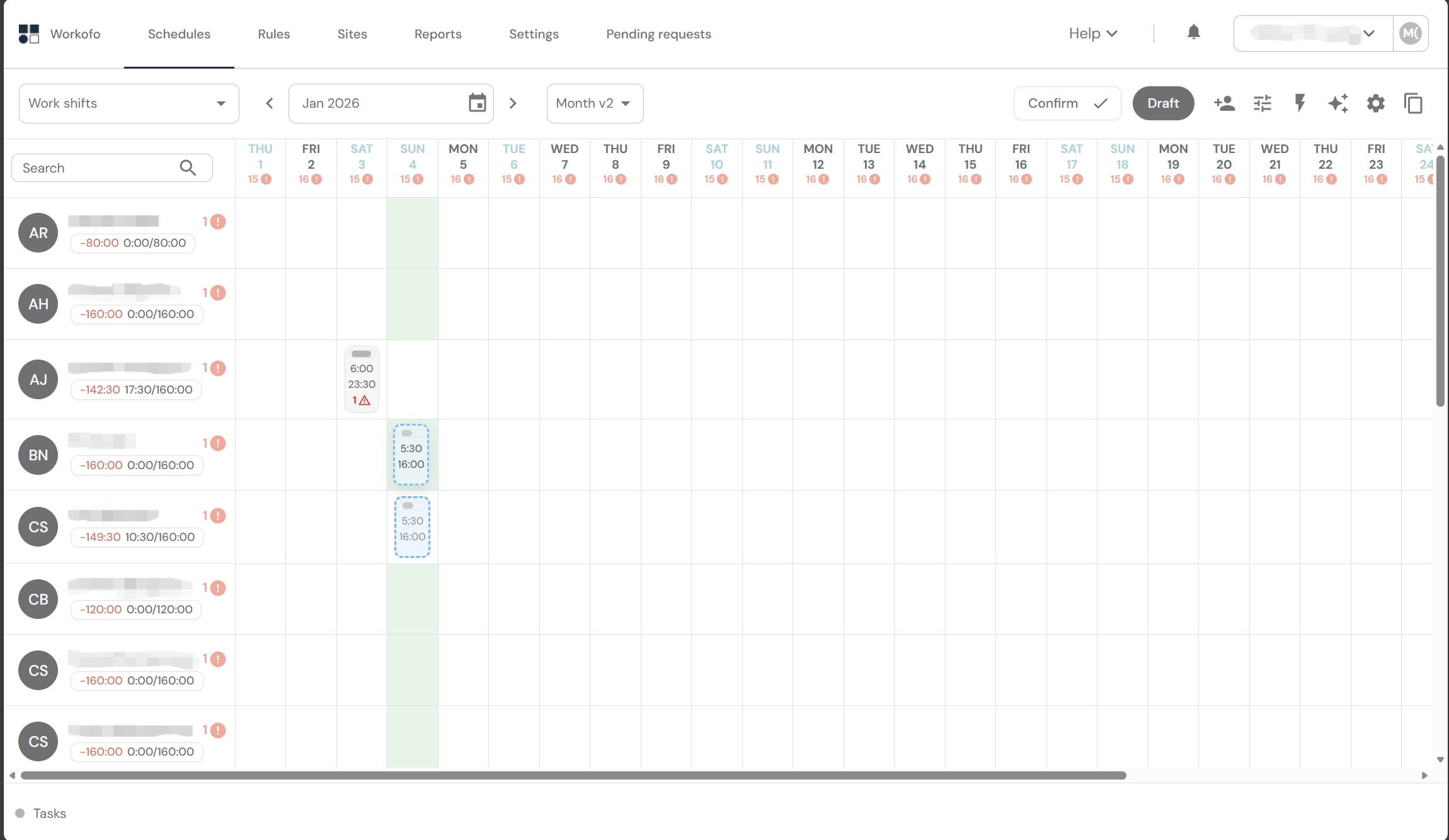 1. Once you have opened the Month V2 view, find the shift you want to change, press (and hold) the left mouse button on the shift and drag it until the system calculates which employees are allowed to work that shift (taking into account legal requirements). Permitted days will be marked in green.