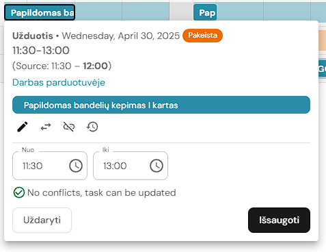 Dienos peržiūroje galima valdyti pamainos užduotis. Galimi veiksmai: