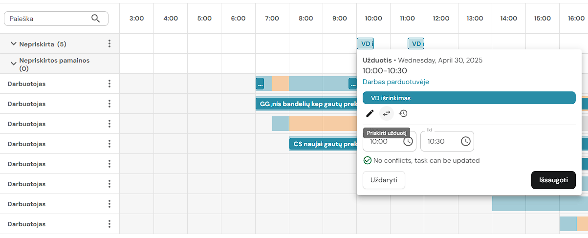 1. Jei užduotis yra priskirta darbuotojo pamainai, ją galima perkelti į nepriskirtų užduočių sąrašą. Paspauskite ant užduoties.