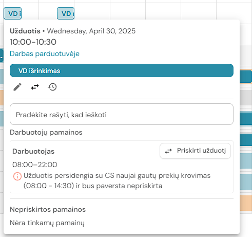 3. Sistema parodys galimus variantus, kas gali atlikti šią užduotį, atsižvelgiant į tvarkaraštyje priskirtas pamaians ir užduoties apribojimus (kompetenciją/lokaciją). Paspaudus mygtuką „Priskirti užduotį“, sistema perkels užduotį iš nepriskirtų užduočių sąrašo pasirinktam darbuotojui.