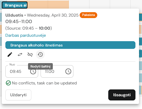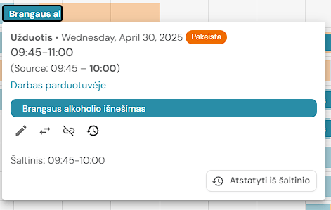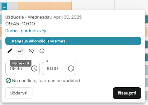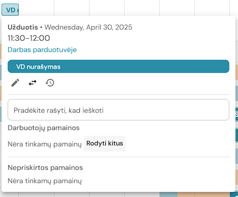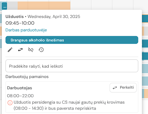 1. Jei užduotis yra priskirta darbuotojo pamainai, ją galima perkelti į kito darbuotojo pamainą (jei yra tokia galimybė). Paspauskite ant užduoties.