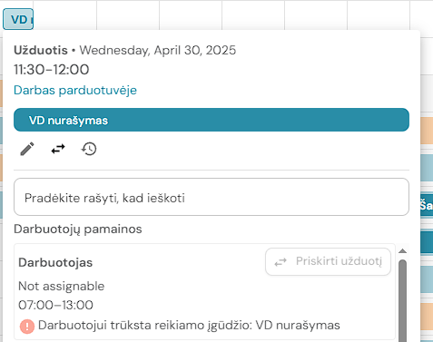Jei nėra galimų variantų, sistema parodys pranešimą ir mygtuką „Rodyti kitus“. Tai skirta suprasti ir ieškoti klaidų, o ne priskirti užduotis pamainoms su klaidomis. Pavyzdžiui, darbuotojas neturi reikiamų įgūdžių užduočiai atlikti.