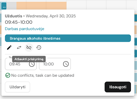 Taip pat jeigu užduotis priskirimas turės konfliktą su kitomis užduotimis/sąlygomis - sistema parodys neatitikimus.