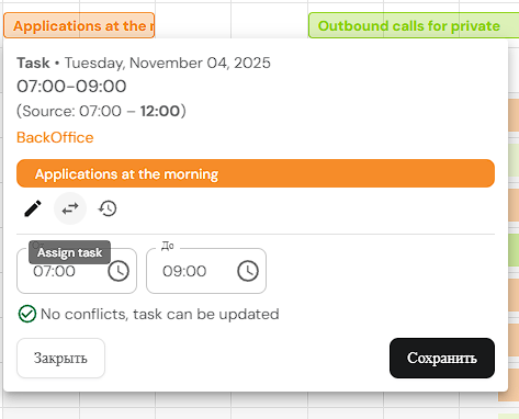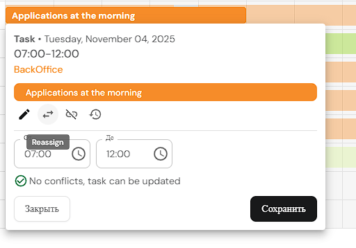 4. Система переместит задачу из смены сотрудника в список неназначенных задач.