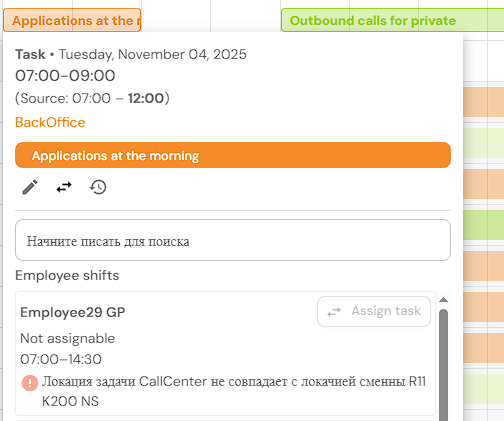 4. Система покажет вам возможные смены в зависимости от времени и укажет причину, по которой некоторые смены не могут иметь эти задачи. Это нужно для понимания и поиска ошибок, а не для назначения задач сменам с ошибками. Например, сотрудник не имеет необходимых навыков для выполнения задачи.