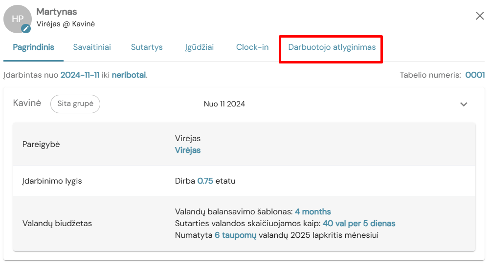 1. Spustelėkite ant darbuotojo vardo (kad atidarytumėte darbuotojo kortelę).