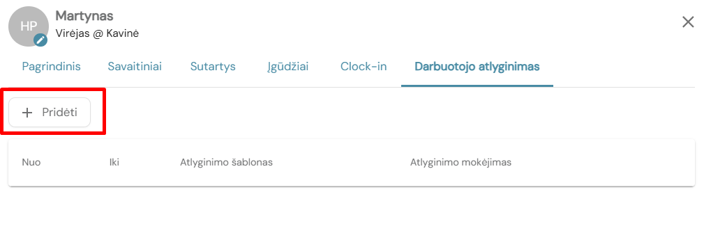 3. Darbuotojo atlyginimo peržiūros lange spustelėkite mygtuką „+Pridėti“.