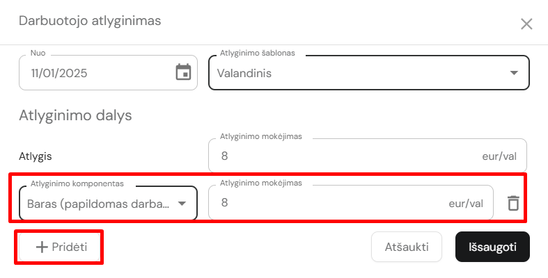 - Sąlyga: šiame pavyzdyje, jei atlyginimo šablonas pasirinktas kaip „Valandinis“ (2-as paveikslėlis), galite spustelėti „+Pridėti“ ir pasirinkti kitą atlyginimo komponentą bei pakoreguoti atlyginimo sumą tam komponentui.