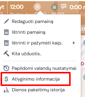 8. Tvarkaraštyje paspaudę pamainą ir pasirinkę „Atlyginimo informacija“ galite pakeisti darbuotojo atlyginimą konkrečiai dienai. Pabrėžtina, jog šis funkcionalumas nėra standartinis.