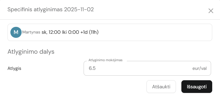 9. Lange galite peržiūrėti darbuotojo vardą ir pavardę, pamainos datą, pamainos trukmę ir atlyginimą. Atlyginimą galima koreguoti šiame lange. Paspaudus mygtuką „Išsaugoti“ įrašas bus išsaugotas.