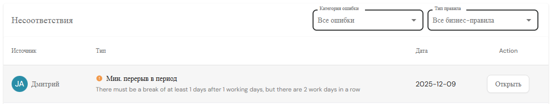 В главном окне системы среди другой полезной информации вы можете увидеть все несоответствия в графике, фильтровать их и переходить к несоответствию конкретного сотрудника в графике.