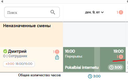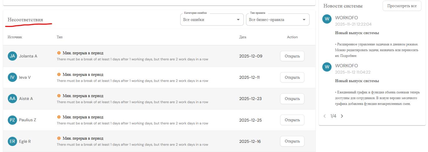В главном окне системы среди другой полезной информации вы можете увидеть все несоответствия в графике, фильтровать их и переходить к несоответствию конкретного сотрудника в графике.