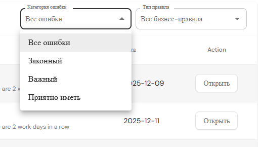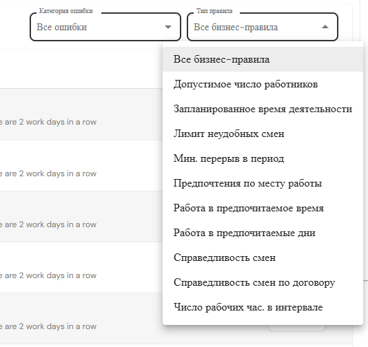 В меню бизнес-правил выберите нужную категорию. Количество доступных для выбора бизнес-правил может варьироваться в зависимости от текущих ошибок в планировании графика работы сотрудников.