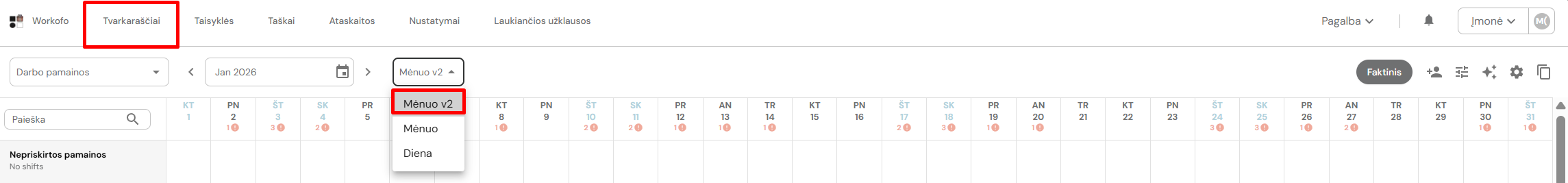 1. Atsidarius Workofo programoje "Tvarkaraščio" langą, renkamės "Mėnuo v2" vaizdą.