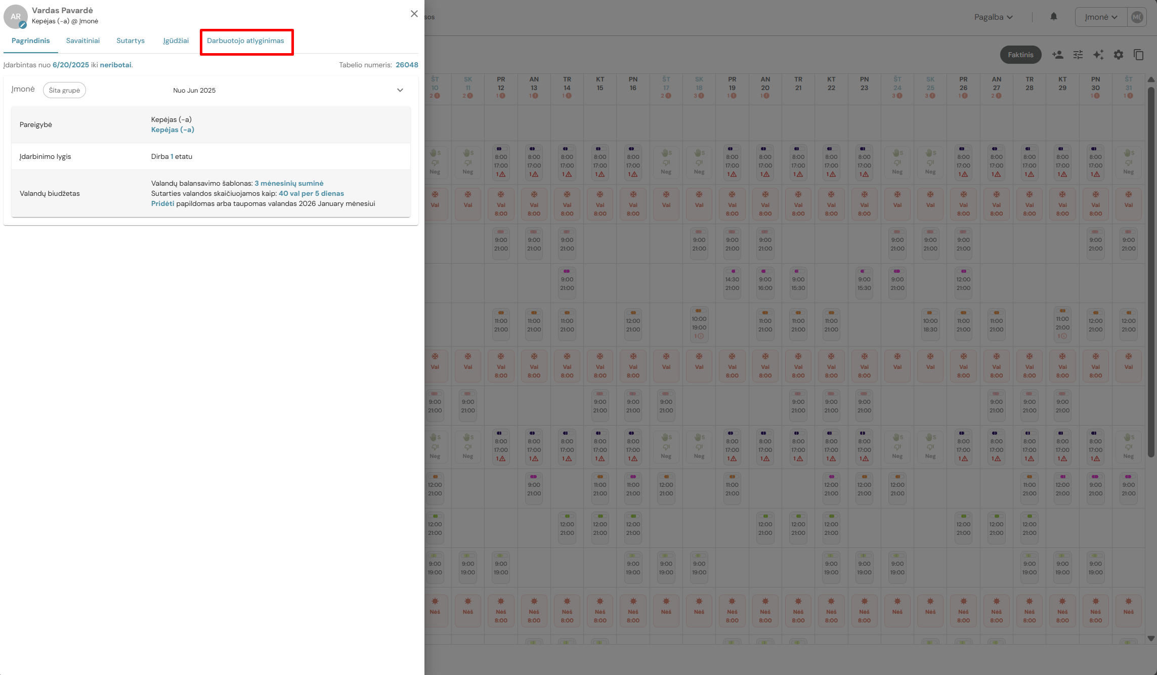 4. Jeigu yra poreikis matyti darbuotojo pamainos kaštus, tuomet patikriname ar darbuotojas (-a), turi užpildytą atlyginimo informaciją. Darbuotojo (-os) informacijos lange renkamės "Darbuotojo atlyginimas".