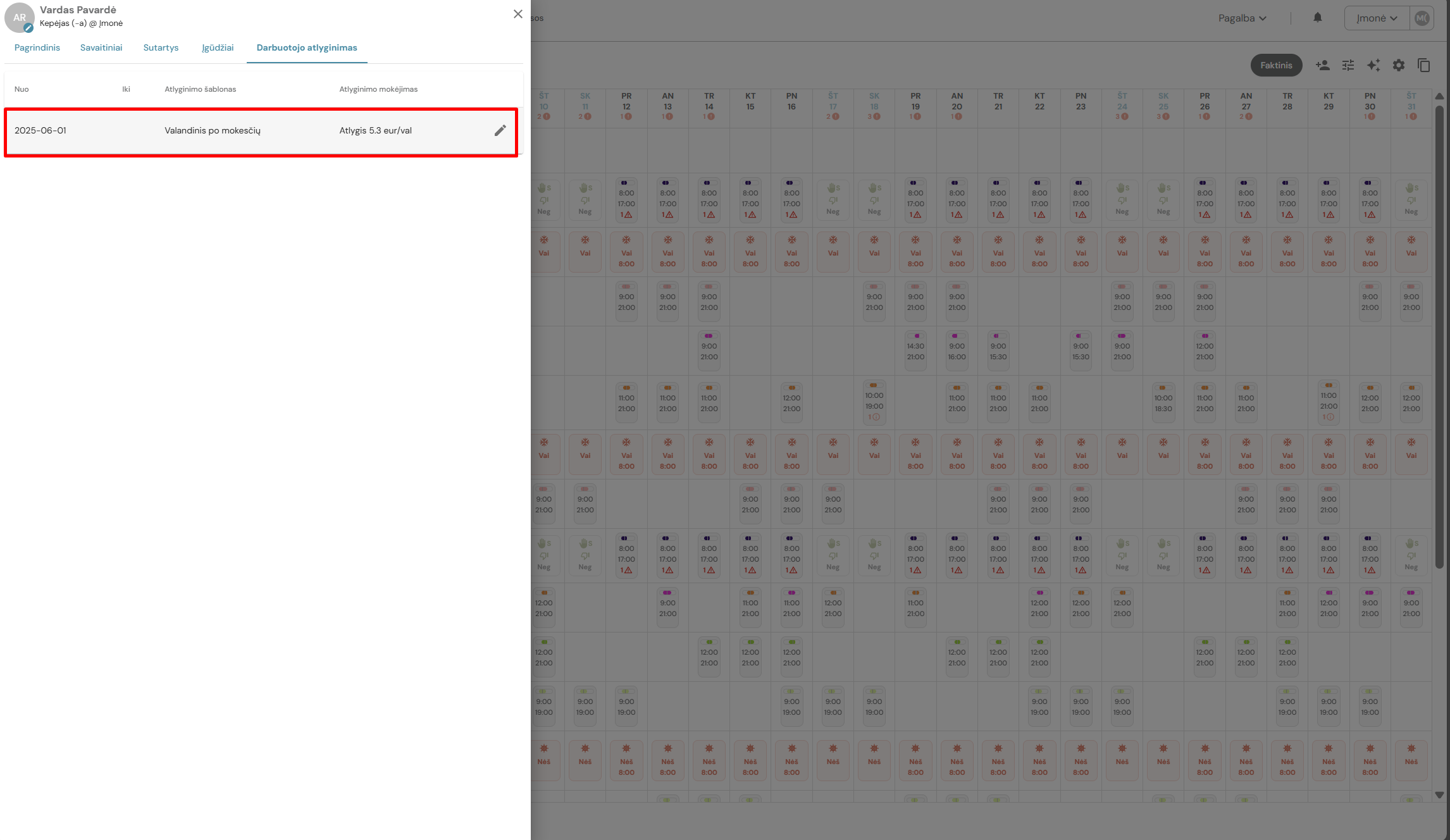 Mėnuo v2 vaizde, galima matyti darbuotojo (-os) valandų paskirstymą į dienines ir naktines, bei pamainos kaštus, jeigu yra užpildytas atlyginimo funkcionalumas.