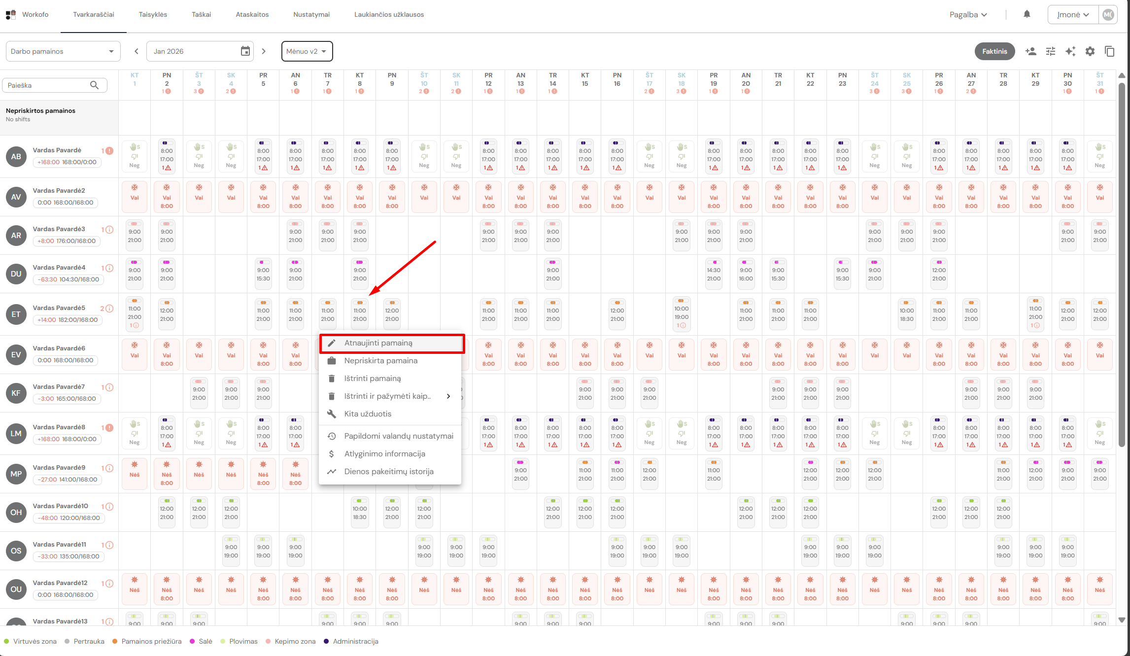 2. Spaudžiame ant norimos pamainos kairiu pelės klavišu ir renkamės "Atnaujinti pamainą"