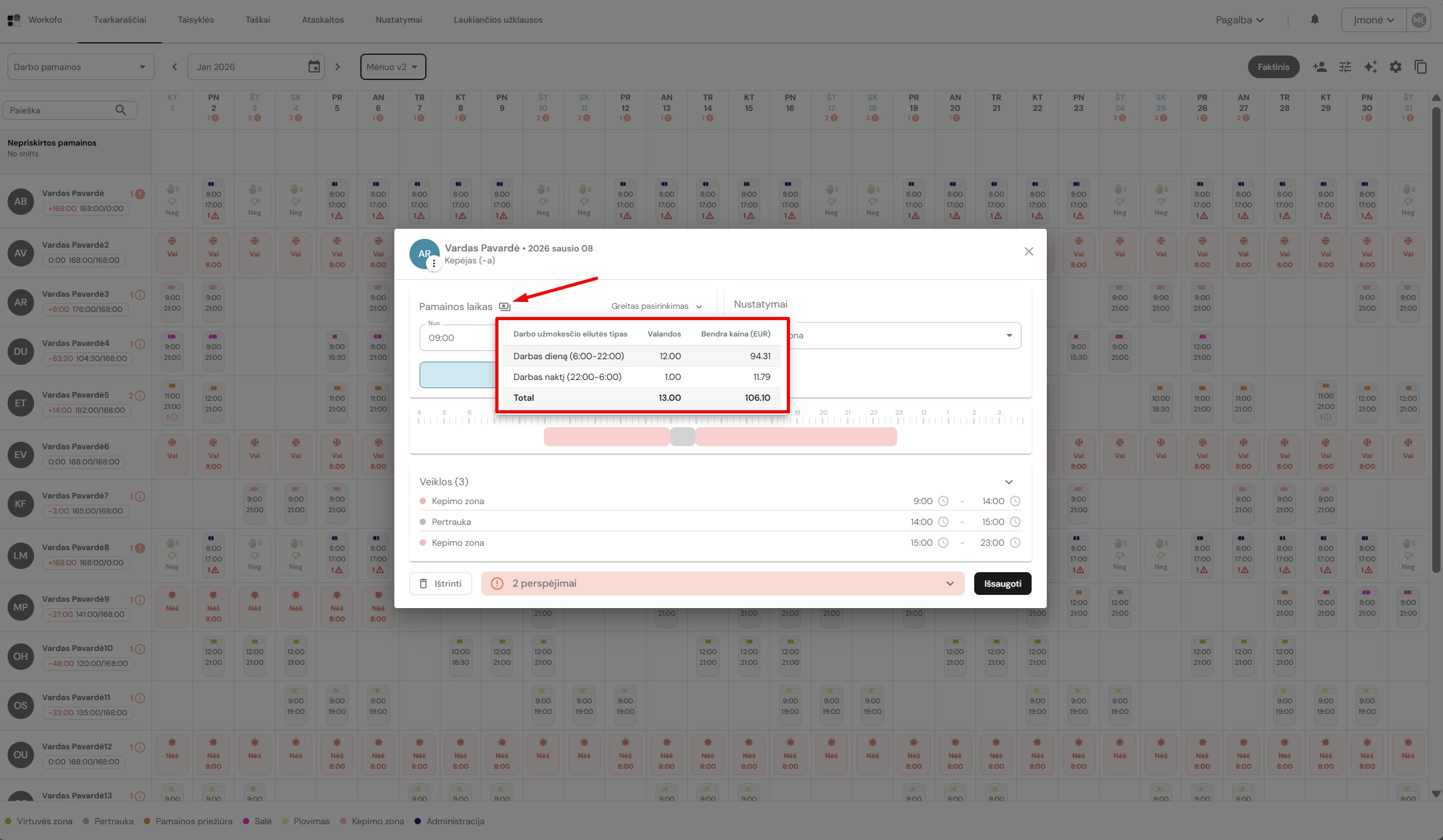 3. Atsidariusiame lange spustelėjus "Pinigėlio" piktogramą išsoks langas kuriame matysite dienines ir naktines valandas bei darbuotojo kaštus už pamainoje dirbtas valandas.