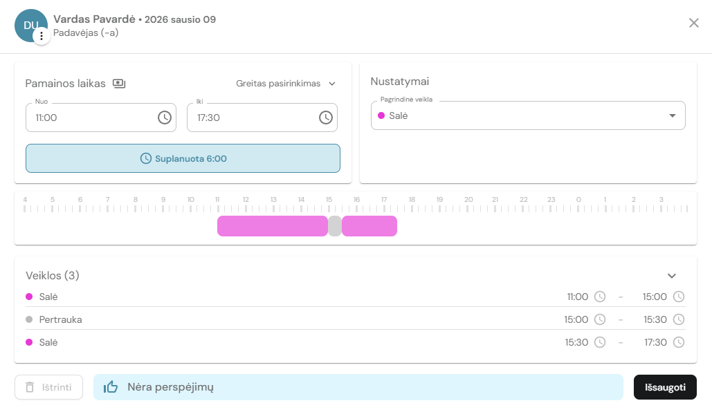 Valandų detalizacija naujame grafiko vaizde pamainų redagavime, galima peržiūrėti tik tuo atveju, jeigu yra perduodami duomenys iš WORKOFO sistemos.