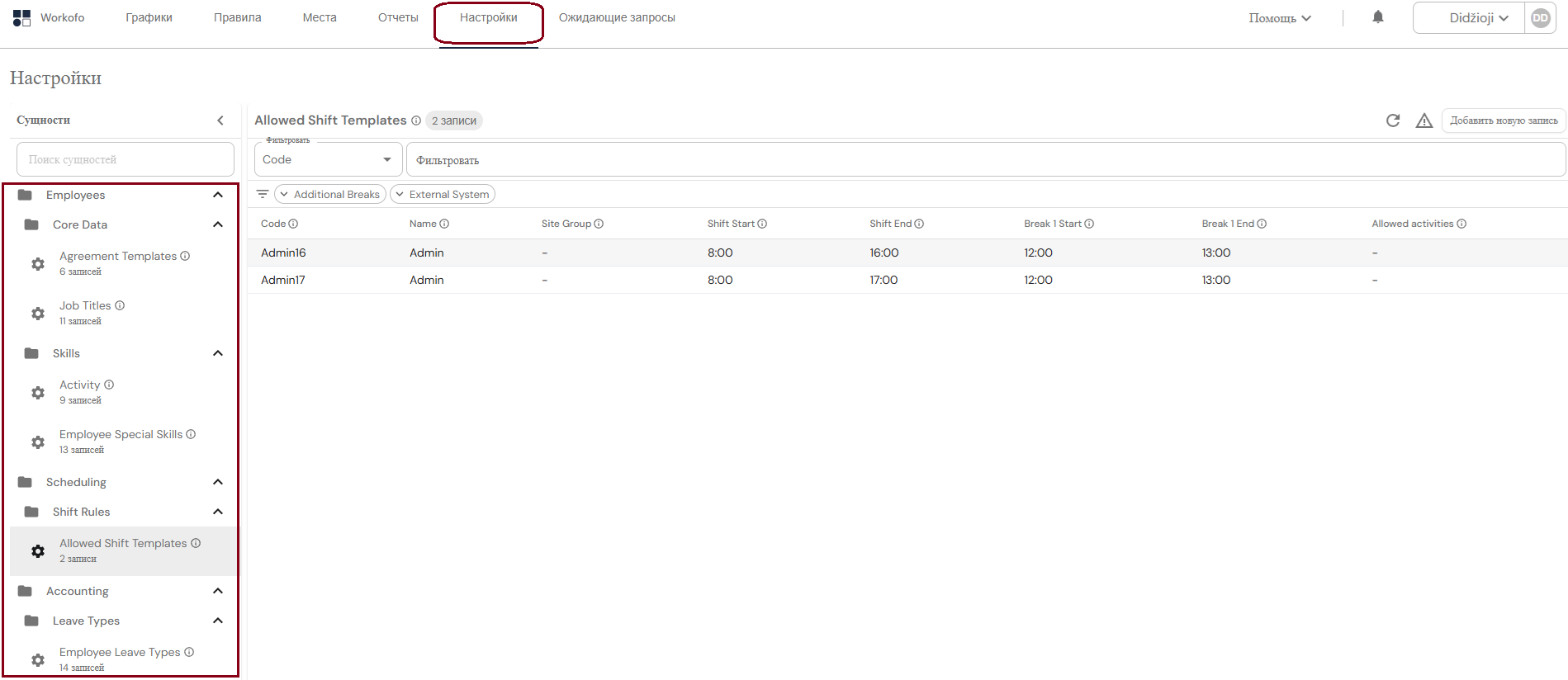 2. На странице «Настройки» вы сможете увидеть страницы конфигурации вашей компании (шаблоны соглашений, должности, коды деятельности, специальные навыки сотрудников, разрешенные шаблоны смен, типы отпусков сотрудников, другие типы заданий).
